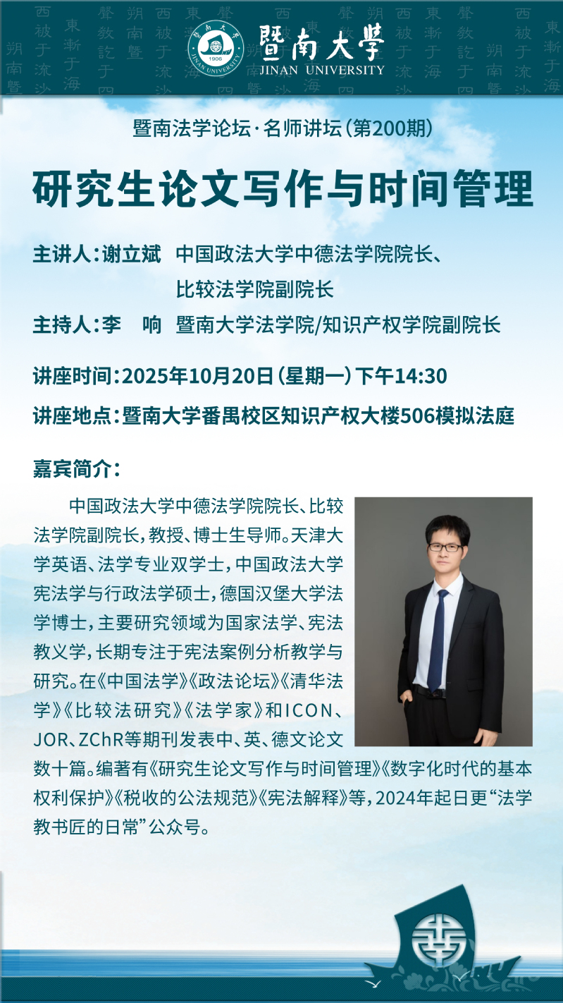 暨南法学论坛·名师讲坛(第200期) | 研究生论文写作与时间管理