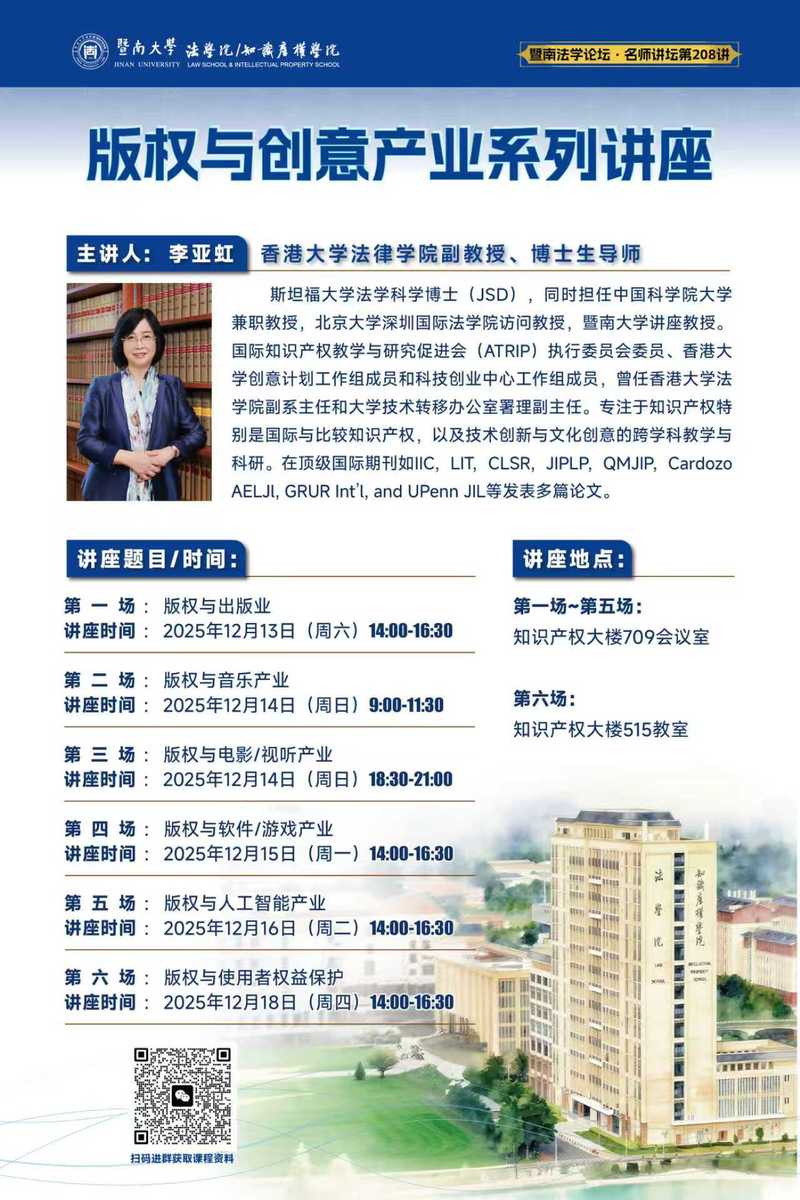 暨南法学论坛.名师讲坛(第208讲) | 版权与创意产业系列讲座