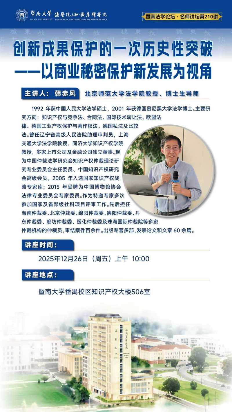 暨南法学论坛.名师讲坛(第210讲) | 创新成果保护的一次历史性突破一一以商业秘密保护新发展为视角
